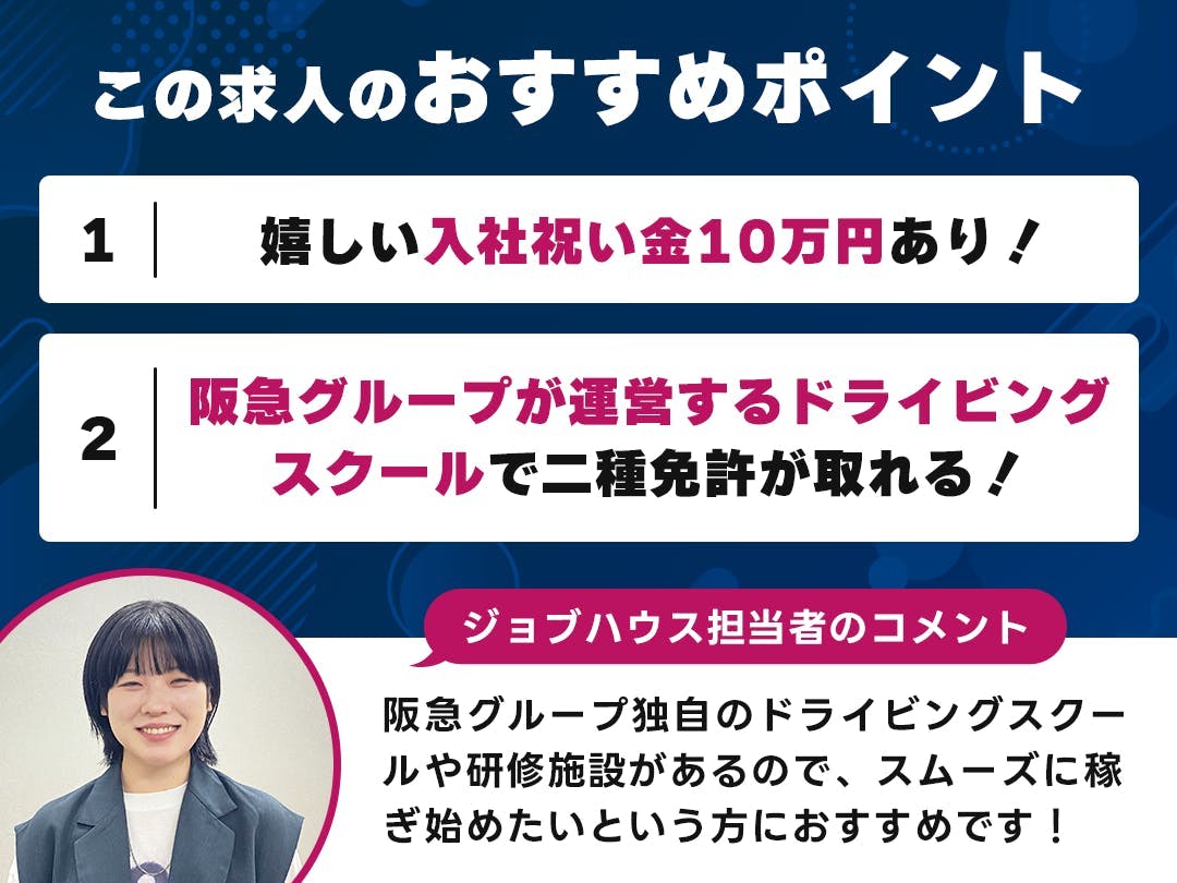 まずはグループが運営する「阪急ドライビングスクール 服部緑地」にて2種免許を取得。もちろん養成期間中も給与が発生するため、入社直後から一定の収入を得ることができるのでご安心ください。